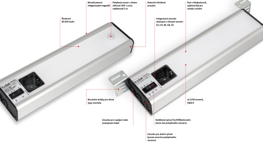 Svítidla ALU-LINE nabízí integrovanou zásuvku jako praktickou p?idanou hodnotu, která je dostupná ve verzích EU, CH, BE nebo GB.