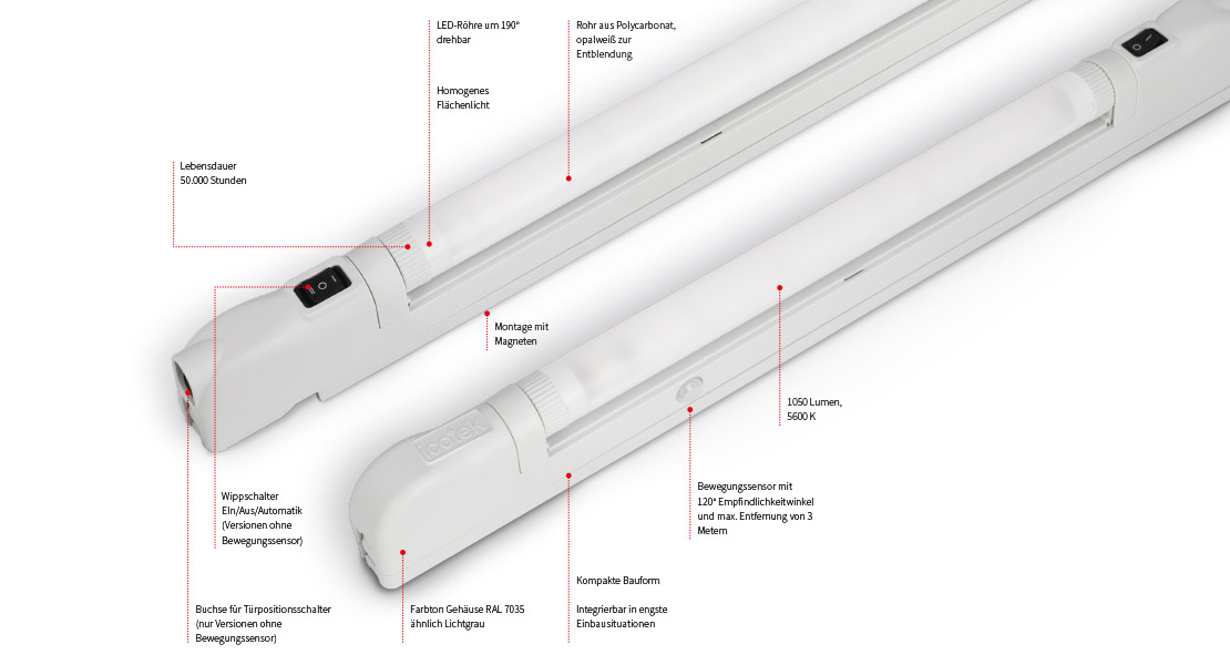 Die High Power LED leuchtet mit 1050 Lumen und bietet eine Lebensdauer von 50.000 Stunden. Das opalwei?e Polycarbonat-Rohr sorgt für ein homogenes, blendfreies Fl?chenlicht.