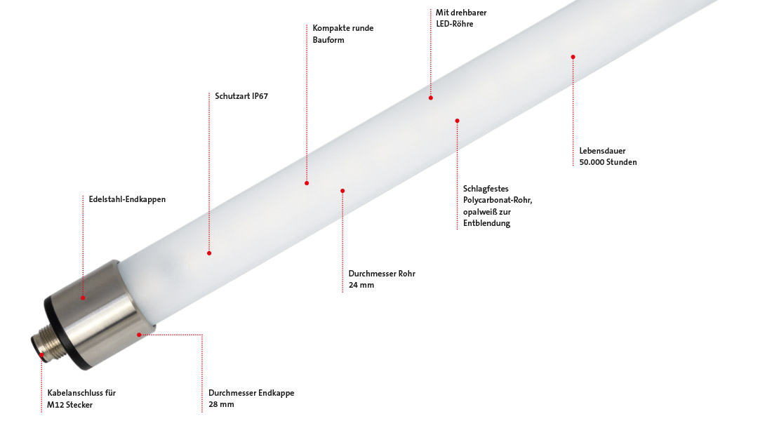 Die TUBE Systemleuchte sorgt für eine effektive Beleuchtung für Maschinen und Anlagen, mit M12 Steckverbindungen für den standardisierten Anschluss.