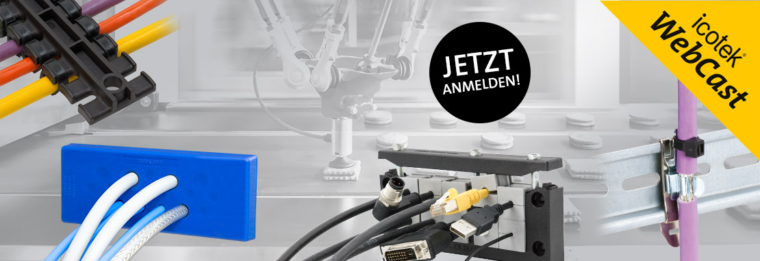Mit den universellen icotek Systemen zur Kabelführung lassen sich Kabel, Leitungen und Schl?uche schnell, sicher und sauber verlegen und gleichzeitig gegen Zug entlasten. Und das sowohl bei statischer als auch bei dynamischer Beanspruchung. Die Einsatzm?glichkeiten reichen vom Verlegen von Leitungen an Maschinen, Schaltschr?nken und Geh?usen bis hin zu Energieführungsketten. Durch verschiedene Montagem?glichkeiten z. B. für die Hutschiene, C-Schiene oder zur Direktmontage bieten sich vielf?ltige Einsatzm?glichkeiten. Die Montage der Leitungen erfolgt durch handelsübliche Kabelbinder. Hinterschneidungen am kammartigen Profil verhindern ein Herausrutschen der Kabelbinder und erm?glichen einen sicheren Halt. Au?erdem stellen wir Ihnen die CONFiX? Schlauchdurchführungen vor, mit welchen sich in Schutzschl?uchen geführte Leitungen sicher und einfach in Maschinen, Steuerpulte oder Schaltschr?nke einführen lassen.