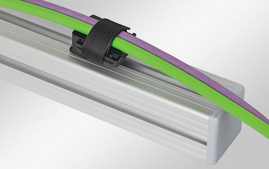 Velcro holder for secure cable routing. 90° twist lock mounting on Bosch Rexroth strut profiles with 8 / 10 mm groove.