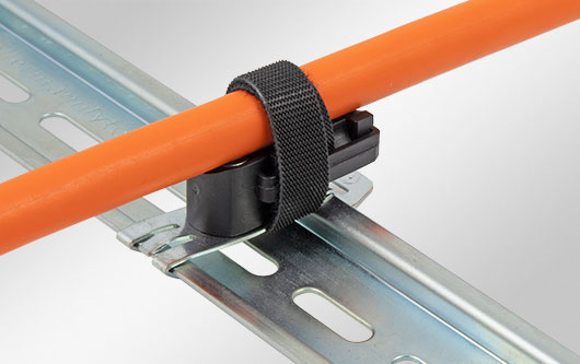 Velcro holder for secure cable routing. Mounting via snap feet on 35 mm top hat DIN rails.