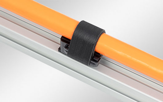 Velcro holder for secure cable routing. 90° twist lock mounting on 80/20 strut profiles in sizes 25 and 40.