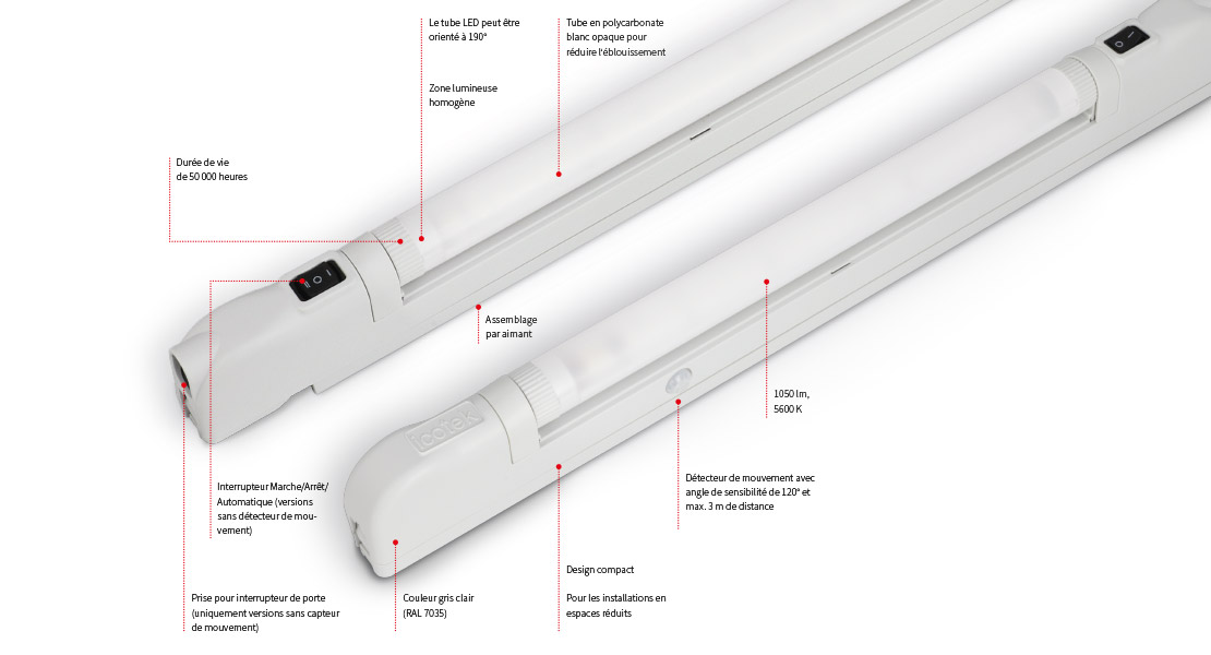 La LED High Power éclaire avec 1050 lumens et offre une durée de vie de 50 000 heures. Le tube en polycarbonate blanc opaque fournit un éclairage de surface homogène et non éblouissant.
