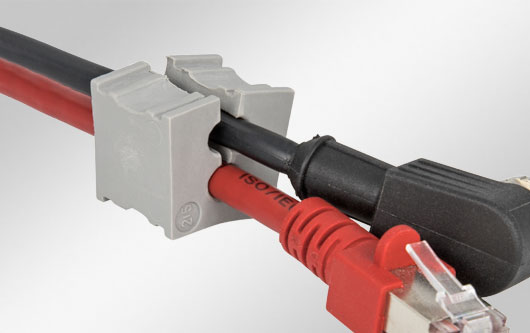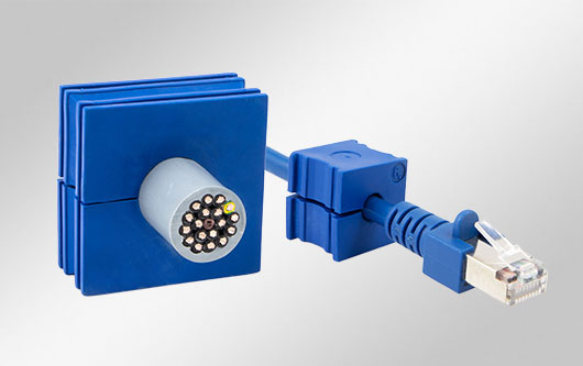 可分式 U 形電纜穿芯,適用于帶或不帶連接器的電纜(線徑范圍為 4 - 11 mm)。 免工具安裝。