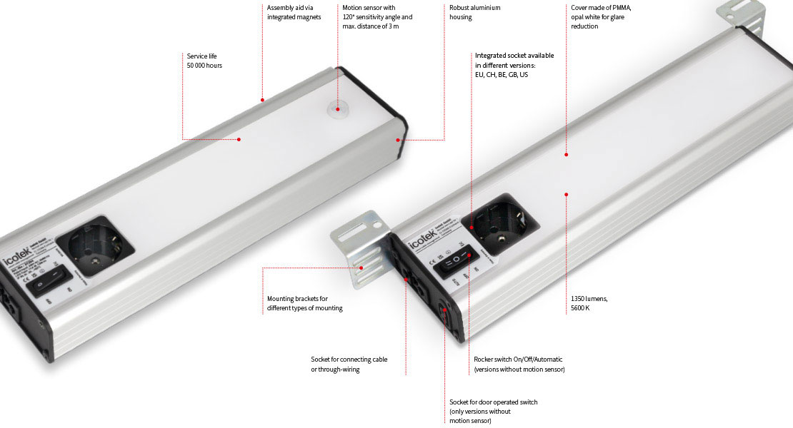 ALU-LINE-valaisimessa on lis?etuna integroitu pistorasia. Saatavana EU-, CH-, BE- tai GB-versio.