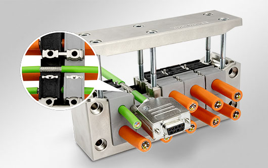 通過使用配備可分式穿芯的易科智連電纜引入系統(tǒng),可以將大量預(yù)制接頭電纜(直徑最大為65毫米)和不帶接頭電纜(直徑最大為75毫米)快速連接到機柜,控制面板和機器中,并且最高能夠達到IP66/UL 4X*型防護等級(根據(jù)EN 60529 / UL50-E認(rèn)證)。此外,電纜引入框架可以釋放電纜受到的應(yīng)力。